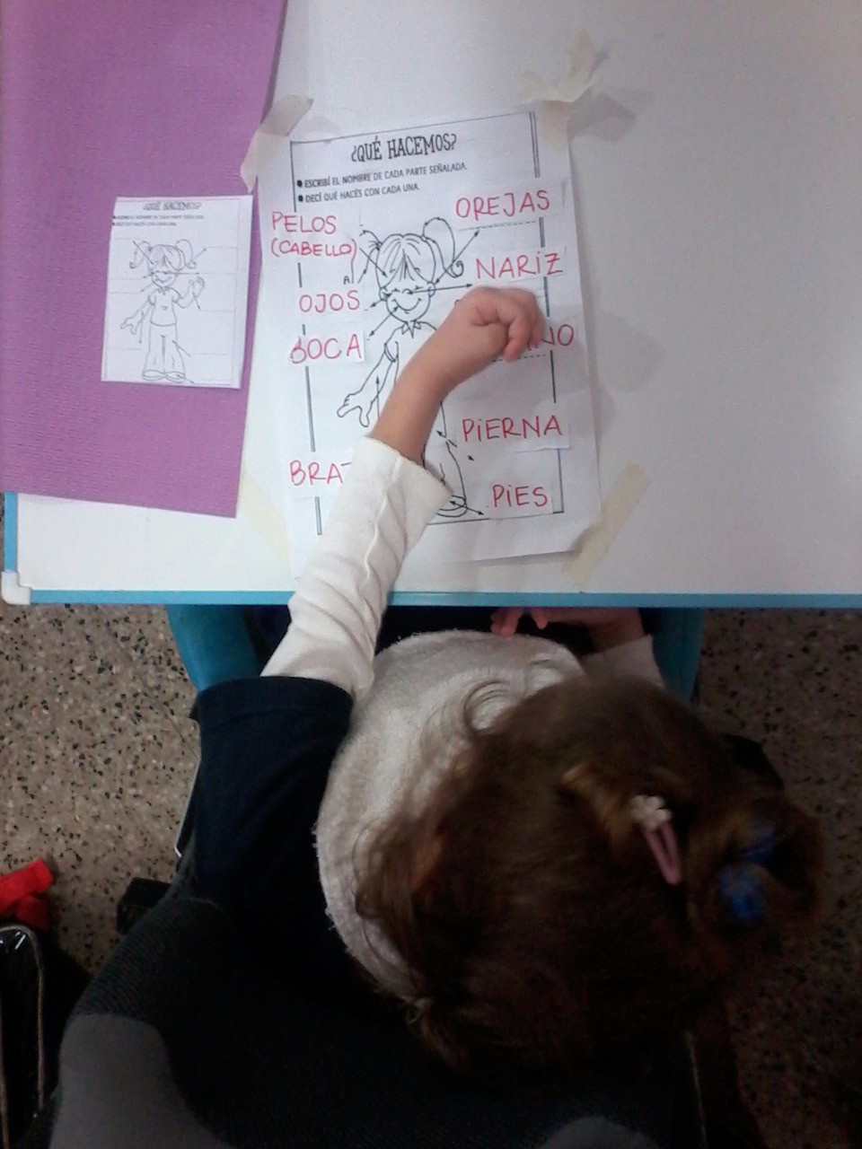 aqui, una adaptacion de acceso viso/motriz: a la izquierda la fotocopia original, a la derecha el tamaño agrandado, se le presentan las palabras de las partes del cuerpo sueltas y ella va señalando el lugar donde se deben ubicar en la fotocopia